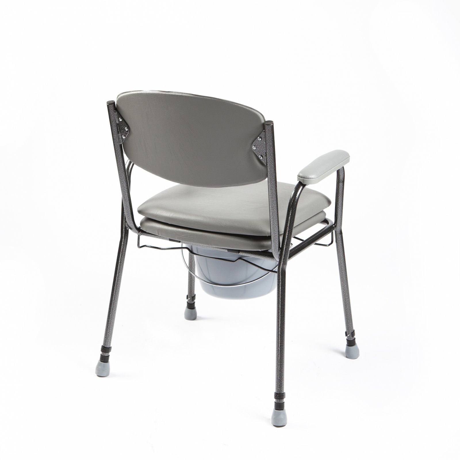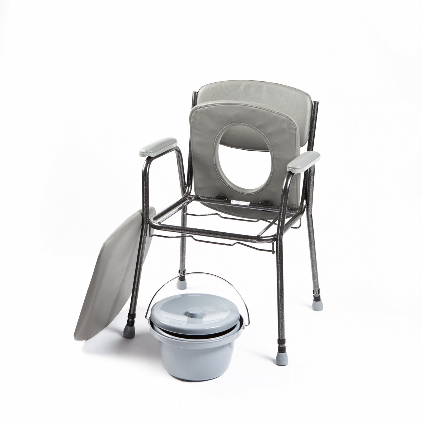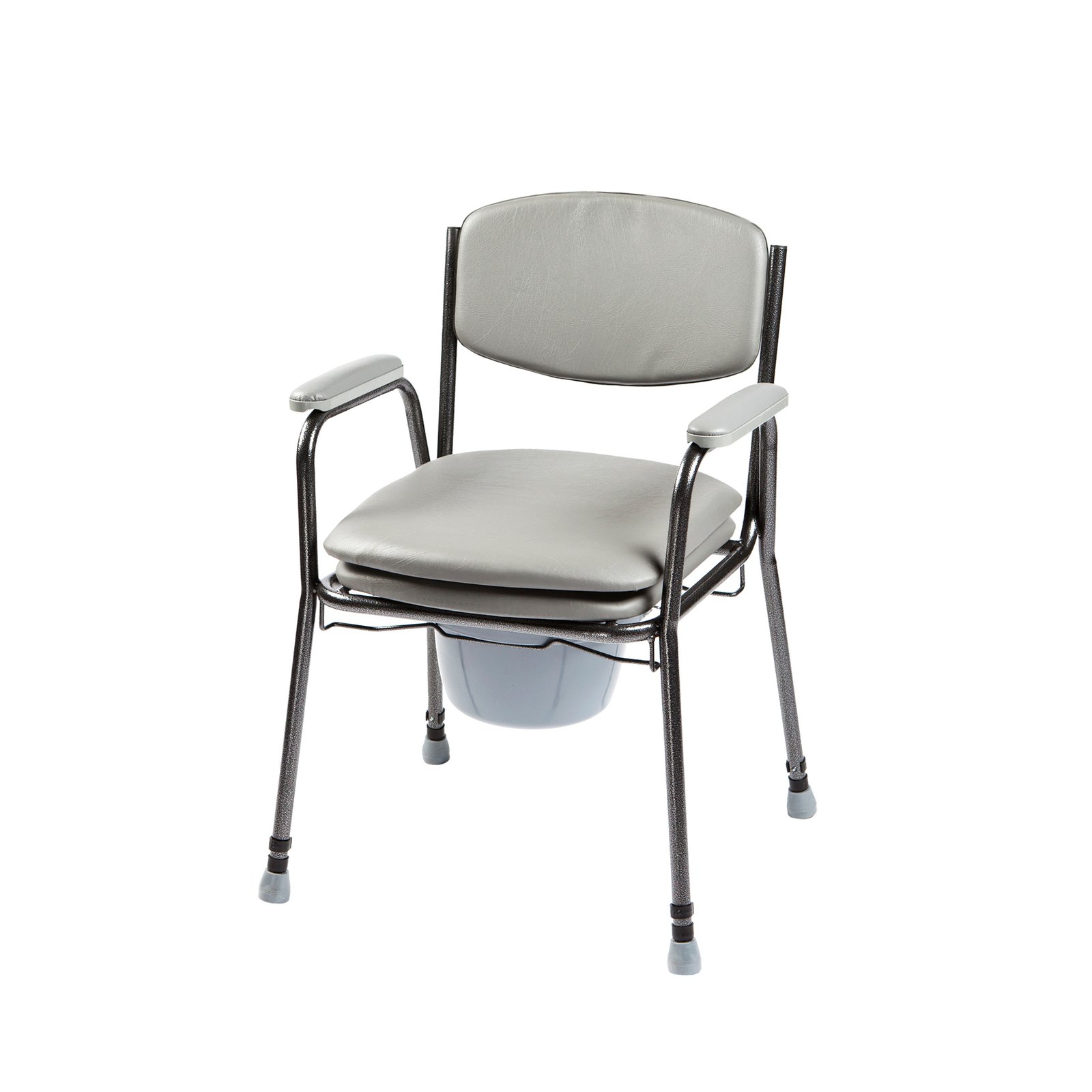 Pilkos spalvos, klasikinio stiliaus tualeto kėdė su paminkštinta sėdyne – praktiškas ir saugus pasirinkimas sunkiai judantiems asmenims arba tais atvejais, kai nėra galimybių naudotis įprastu tualetu. Prireikus gaminys gali būti naudojamas ir kaip patogi, minkšta kėdė.