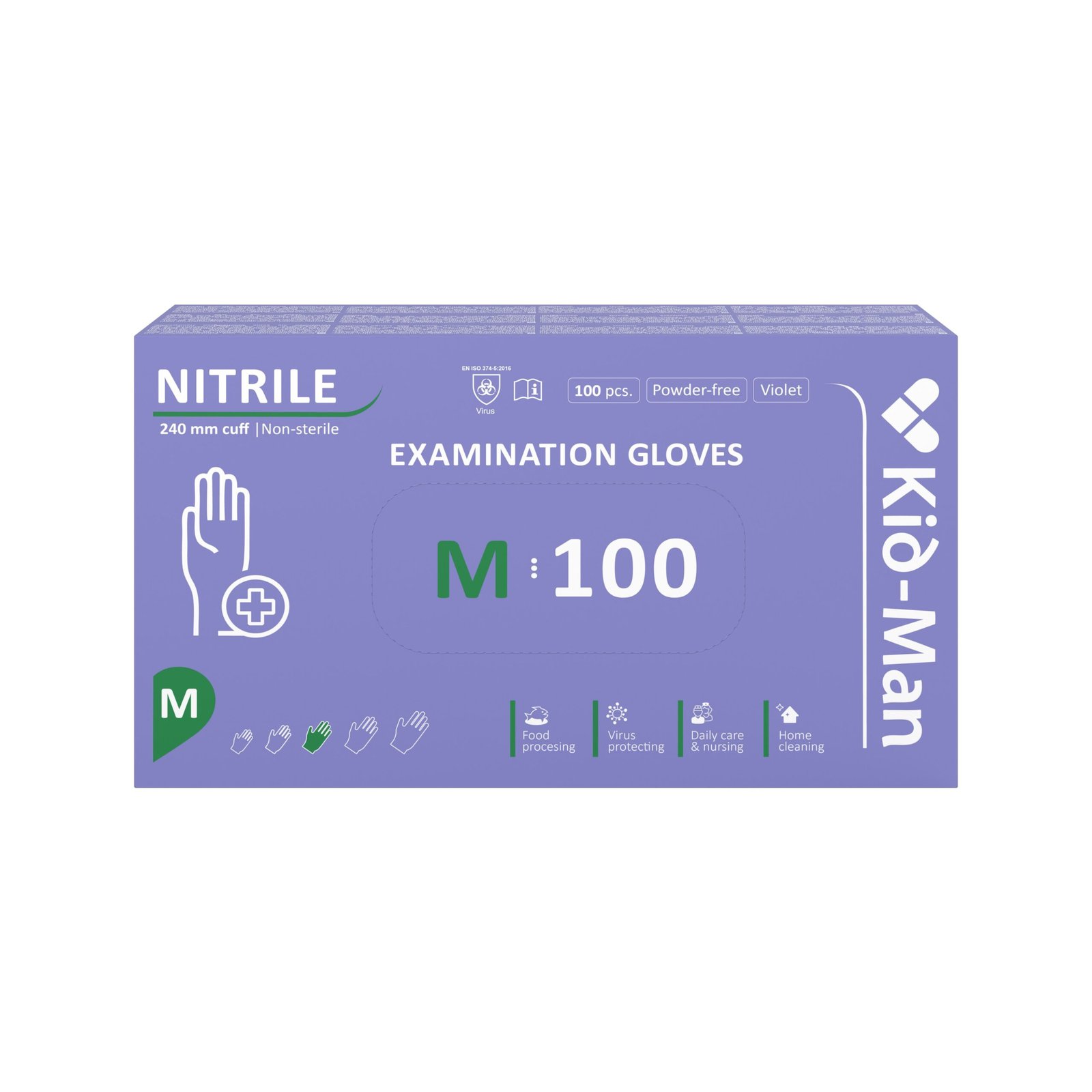 Nesterilios, elastingos, lanksčios ir atsparios nitrilo pirštinės be pudros, tekstūrinio paviršiaus ir neslopinančios jautrumo. Aukšto lygio apsauga nuo daugelio cheminių ir infekcinių medžiagų. Suderinamos su vandens ir alkoholio tirpalais bei geliais. Medicininės pirštinės atitinka dviejų naujų reglamentų – Medicinos prietaisų (2017/745 ES) ir Asmeninių apsaugos priemonių (2016/425 ES) – specifikacijas. Šios aukšto lygio apsaugos pirštinės, priklausančios APP (asmeninėms apsaugos priemonėms), priskiriamos III KAT. Jos gerai apsaugo nuo mikroorganizmų, o ypač – nuo virusų. Be to, pirštinės yra išbandytos ir atitinka standartus EN455, EN374, EN420. Galiausiai šios pirštinės yra išbandytos pagal Amerikos standartą ASTM D6978 dėl citostatinių medžiagų prasiskverbimo, jos itin stipriai apsaugo, tinka visiems, turintiems sąlytį su citostatinėmis molekulėmis. Pirštinės pritaikytos naudoti įvairiose srityse, įskaitant medicinos specialistus. Dėžutėje yra 100 pirštinių, nitrilo medicininės pirštinės yra 4 dydžių: S, M, L, XL.
